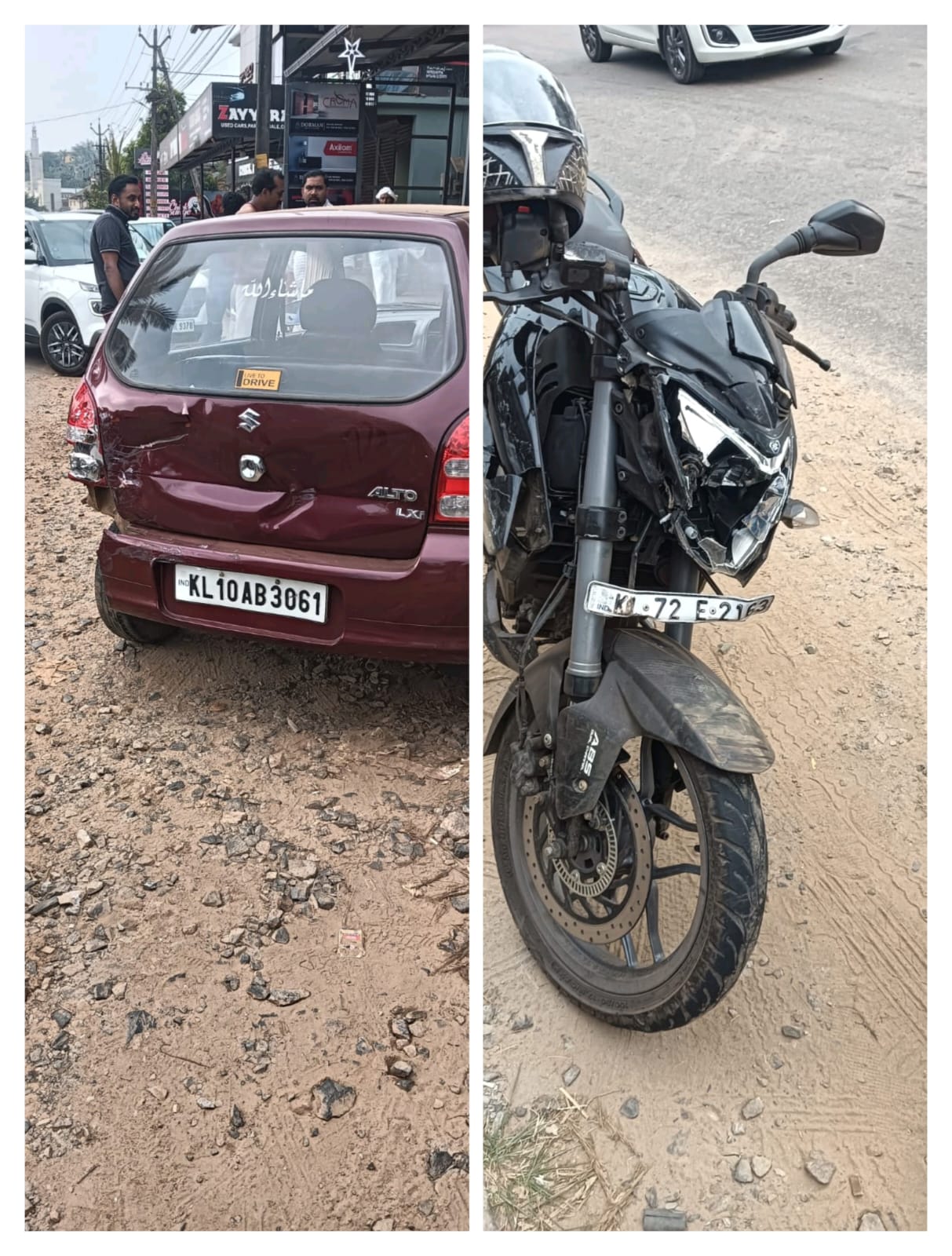 മാനന്തവാടി അടുത്ത് അഞ്ചാംമൈൽ കെല്ലൂർ ബൈക്കും കാറും കൂട്ടി ഇടിച്ച് ബൈക്ക് യാത്രകാരന് പരിക്ക് പരിക്കേറ്റ ബൈക്ക് യാത്രക്കാരനെ മാനന്തവാടി മെഡിക്കൽ കോളേജിലേക്ക് മാറ്റി KL-72-E-2163 എന്ന ബൈക്കും KL-10-AB-3061 എന്ന ആൾട്ടോ കാറും ആണ് അപകടത്തിൽ പെട്ടത്
