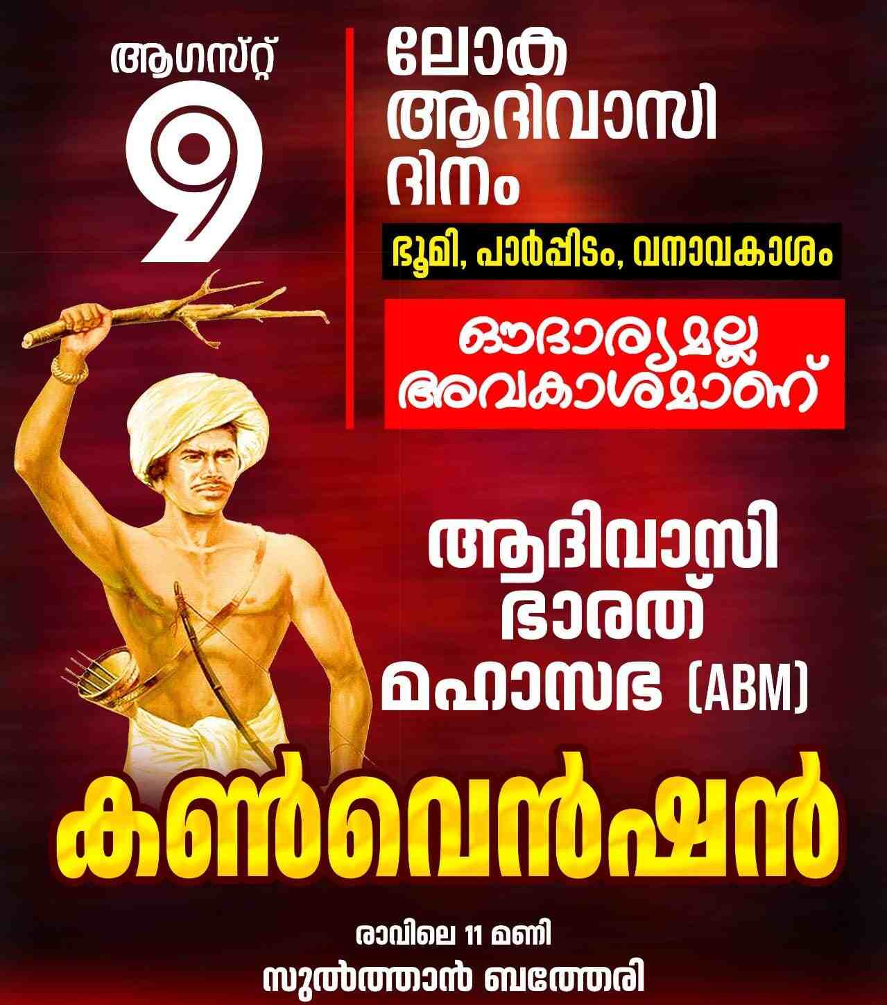 കൽപറ്റ: ലോക ആദിവാസി ദിനമായ ഓഗസ്റ്റ് 9 ന് ആദിവാസി ഭാരത് മഹാസഭ ബത്തേരിയിൽ കൺവൻഷൻ നടത്തും. സി.പി.ഐ(എം.എൽ) റെഡ് സ്റ്റാർ സംസ്ഥാന സെക്രട്ടറി എം.പി. കുഞ്ഞിക്കണാരൻ ഉദ്ഘാടനം ചെയ്യും. എ.ബി.എം സംസ്ഥാന കോ – ഓർഡിനേറ്റർ എ.എം അഖിൽ കുമാർ, എ.ഐ.കെ. കെ. എസ് സംസ്ഥാന കോ-ഓർഡിനേറ്റർ കെ. ബാബുരാജ് എന്നിവർ കൺവൻഷനിൽ സംസാരിക്കും. ഭൂമി, പാർപ്പിടം, വനാവകാശം എന്നിവ ഔദാര്യമല്ല; അവകാശമാണ് എന്ന മുദ്രവാക്യം സംഘടന ഉയർത്തിപ്പിടിക്കുമെന്നും അത് നേടിയെടുക്കുന്നതിന് വേണ്ടി ജനാധിപത്യ രീതിയിൽ
