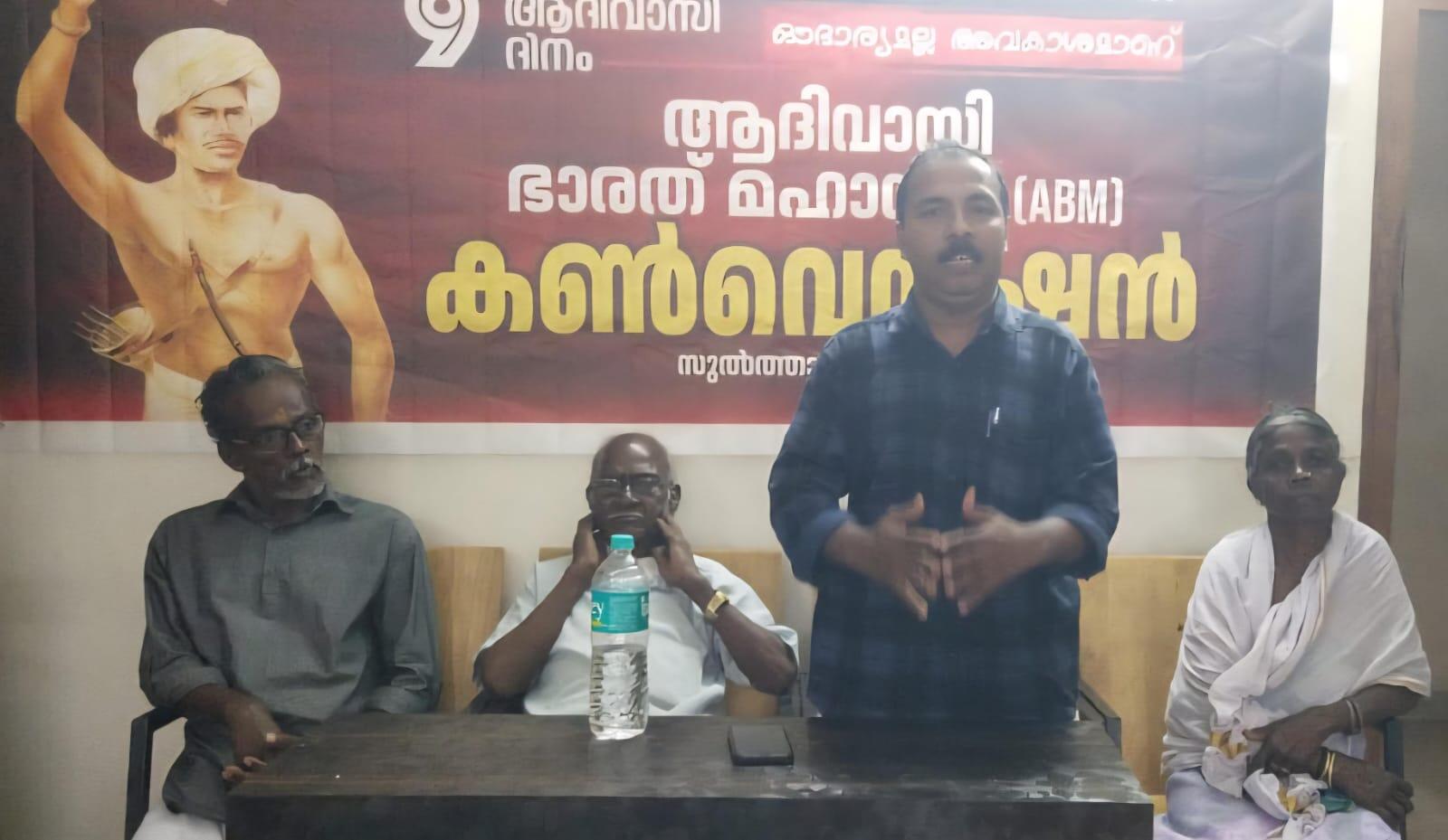 ബത്തേരി:ആദിവാസി ഭാരത് മഹാസഭ കൺവൻഷൻ സംസ്ഥാന കോ ഓർഡിനേറ്റർ എ. എം. അഖിൽ കുമാർ ഉദ്ഘാടനം ചെയ്തു. ഒണ്ടൻ പണിയൻ അധ്യക്ഷത വഹിച്ചു. എ.കെ. രാജൻ അവതരിപ്പിച്ച ഭൂമി, പാർപ്പിടം, വനാവകാശം എന്നിവ ഔദാര്യമല്ല; അവകാശമാണ് എന്ന പ്രമേയം കൺവൻഷൻ ഐകകണ്ഠേന അംഗീകരിച്ചു. ഭൂസമര സമിതി ജില്ലാ കൺവീനർ എം.കെ. ഷിബു, പശ്ചിമഘട്ട സംരക്ഷണ സമിതി പ്രസിഡൻ്റ് പി.ജി. മോഹൻദാസ് തുടങ്ങിയവർ സംസാരിച്ചു.