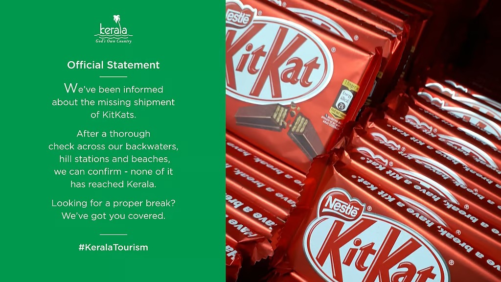 ‘കാണാതായ കിറ്റ്കാറ്റ് ഷിപ്പിങ്ങിനെക്കുറിച്ച് ഞങ്ങൾക്കും വിവരം ലഭിച്ചിട്ടുണ്ട്. ഞങ്ങളുടെ കായലുകളിലും മലയോരത്തും കടൽതീരങ്ങളിലും വിശദമായ പരിശോധന നടത്തി. അവയൊന്നും കേരളത്തിൽ എത്തിയിട്ടില്ലെന്ന് സ്ഥിരീകരിച്ചിട്ടുണ്ട്. ശരിക്കുമൊരു ബ്രേക്ക് ആവശ്യമാണോ? എങ്കിൽ ഞങ്ങൾ നിങ്ങൾക്കൊപ്പമുണ്ട്’- എന്നാണ് കേരള ടൂറിസം സോഷ്യൽ മീഡിയാ പേജിൽ കുറിച്ചിരിക്കുന്നത്.