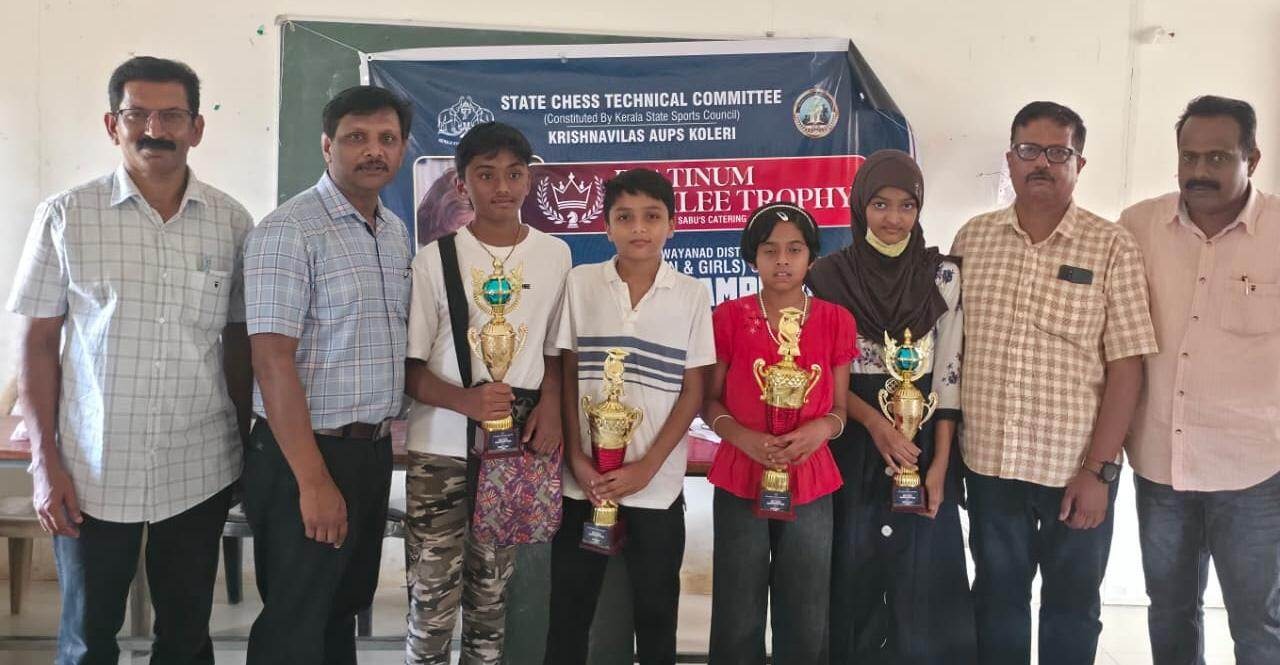 കൽപറ്റ:കോളേരി കൃഷ്ണ വിലാസ് എ.യു. പി. സ്കൂളിൻ്റെ പ്ലാറ്റിനം ജൂബിലിയോടനുബന്ധിച്ച് സ്റ്റേറ്റ് ചെസ്സ് ടെക്നിക്കൽ കമ്മിറ്റി സംഘടിപ്പിച്ച U – 13 സെലക്ഷൻ ചെസ്റ്റ് ചാമ്പ്യൻഷിപ്പിൽ ഓപ്പൺ വിഭാഗത്തിൽ ആർ.സി.ആദി ദിയാനും പെൺകുട്ടികളുടെ വിഭാഗത്തിൽ ജൊഹാന അജിയും ചാമ്പ്യന്മാരായി . അനുഗ്രഹ് ഇമ്മാനുവൽ ഷാജി, ആയിഷ സന എന്നിവർ യഥാക്രമം രണ്ടാം സ്ഥാനം കരസ്ഥമാക്കി. നാല് പേരും സംസ്ഥാന U-13 ചെസ് ചാമ്പ്യൻഷിപ്പിലേക്ക് വയനാട് ജില്ലയിൽ നിന്നു യോഗ്യത നേടി. വിനീഷ് പി.എസ് , സന്തോഷ് വി ആർ , അഭിനവ് രാജ്, സുനിൽ എം കെ , ശ്രീലാൽ മാസ്റ്റർ എന്നിവർ നേതൃത്വം നൽകി . സംസ്ഥാന വോളിബോൾ അസ്സോസിയേഷൻ വൈസ് പ്രസിഡൻ്റ് പി.ബി ശിവൻ ഉദ്ഘാടനം ചെയ്തു. മനോജ് മാസ്റ്റർ സമ്മാനം നൽകി.