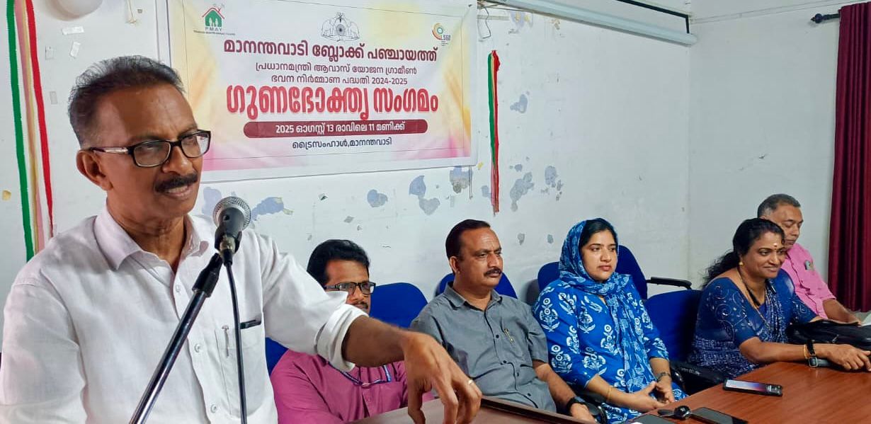 മാനന്തവാടി ബ്ലോക്ക് പഞ്ചായത്തിലെ തൊണ്ടർനാട്, വെള്ളമുണ്ട, എടവക, തവിഞ്ഞാൽ, ഗ്രാമപഞ്ചായത്തുകളിലെ പിഎംഎവൈ ഭവന നിർമ്മാണ പദ്ധതി ഗുണഭോക്താക്കളുടെ സംഗമം ബ്ലോക്ക് ട്രൈസം ഹാളിൽ നടന്നു. ക്ഷേമകാര്യ സ്റ്റാന്റിങ് കമ്മിറ്റി ചെയർപേഴ്സൺ സൽമ മോയിൻ അധ്യക്ഷനായ യോഗം ബ്ലോക്ക് പഞ്ചായത്ത് പ്രസിഡന്റ് ജസ്റ്റിൻ ബേബി ഉദ്ഘാടനം ചെയ്തു.