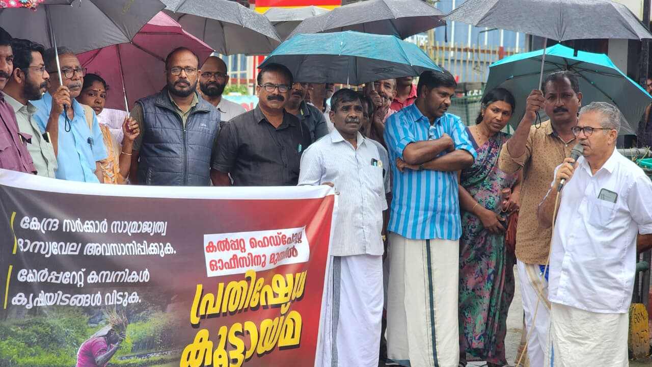 കൽപറ്റ ഹെഡ് പോസ്റ്റ് ഓഫിസിനു മുന്നിൽ സിഐടിയു ജില്ലാ പ്രസിഡൻ്റ് പി . വി . സഹദേവൻ ഉദ്ഘാടനം ചെയ്തു. എഐടിയുസി ജില്ലാ സെക്രട്ടറി സി എസ് സ്റ്റാൻലി അധ്യക്ഷത വന്നിച്ചു. എം മധു, കെ സുഗതൻ, എം.ഡി. സെബാസ്റ്റ്യൻ, ജെയിൻ ആൻ്റണി, കെ മുഹമ്മദ് കുട്ടി, പി കെ അബു, ബീന രതീഷ്, നിജിത സുഭാഷ് എന്നിവർ സംസാരിച്ചു. കർഷക സംഘം സംഘം ഏരിയാ സെക്രട്ടറി കെ അബ്ദുറഹിമാൻ സ്വാഗതവും കെഎസ്കെടിയു ജില്ലാ വൈസ് പ്രസിഡൻ്റ് വി ബാവ നന്ദിയും പറഞ്ഞു.