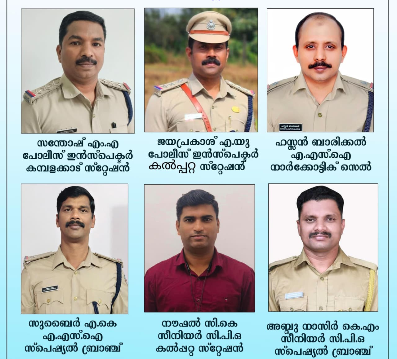 കല്പ്പറ്റ: കേരള മുഖ്യമന്ത്രിയുടെ 2025-ലെ പോലീസ് മെഡലിന് ജില്ലയില് നിന്ന് ആറു പോലീസ് ഉദ്യോഗസ്ഥര് അര്ഹരായി. കമ്പളക്കാട് പോലീസ് സ്റ്റേഷന് ഇന്സ്പെക്ടര് എസ്.എച്ച്.ഒ സന്തോഷ് എം.എ, കൽപ്പറ്റ സ്റ്റേഷന് ഇന്സ്പെക്ടര് എസ്.എച്ച്.ഒ എ.യു. ജയപ്രകാശ്, നാര്ക്കോട്ടിക് സെല് എ.എസ്.ഐ ഹസ്സന് ബാരിക്കല്, ജില്ലാ സ്പെഷ്യല് ബ്രാഞ്ച് എ.എസ്.ഐ എ.കെ. സുബൈര്, കല്പ്പറ്റ സ്റ്റേഷന് സീനിയര് സി.പി.ഒ സി.കെ. നൗഫല്, ജില്ലാ സ്പെഷ്യല് ബ്രാഞ്ച് സീനിയര് സി.പി.ഒ കെ.എം. അബ്ദു നാസിര് എന്നിവര്ക്കാണ് പോലീസ് മെഡല്