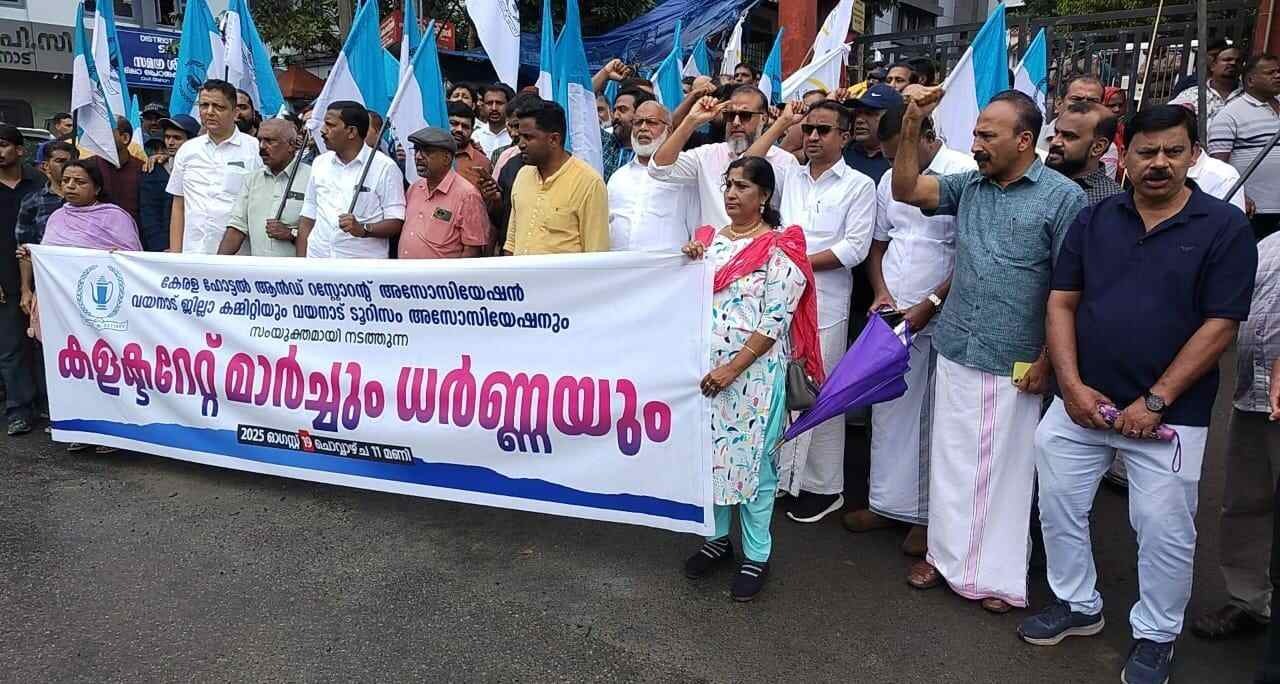 കൽപറ്റ : കേരള ഹോട്ടൽ & റസ്റ്റോറന്റ് അസോസിയേഷനും, വയനാട് ടൂറിസം അസോസിയേഷനും സംയുക്തമായി വയനാട് കലക്ടറേറ്റിലേക്ക് മാർച്ചും ധാ ർണയും നടത്തി. ഹോട്ടൽ മേഖലയിലെയും ടൂറിസം മേഖല യിലും വിവിധ വിഷയങ്ങൾ ചൂണ്ടിക്കാണിച്ചായിരുന്നു സമരം. അവശ്യ സാധനങ്ങളുടെ വിലവർധന നിയന്ത്രിക്കുക, പൂഴ്ത്തി വയ്പ് തടയുക, പൊല്യൂഷൻ കൺട്രോൾ ബോർഡിന്റെ അനാവശ്യ നിയമങ്ങൾ പിൻവലിക്കുക, ടൂറിസം മേഖലകളിലെ അനാവശ്യ നിയന്ത്രണങ്ങൾ പിൻവലിക്കുക, മുന്നറിയിപ്പില്ലാതെ ടൂറിസം കേന്ദ്രങ്ങൾ അടച്ചിടുന്നത് നിർത്തലാക്കുക, ടൂറിസം മേഖലകളിലെ നിയന്ത്രണങ്ങൾ പിൻവലിക്കുക, വയനാട്ടിലേക്കുള്ള ഗതാഗത പ്രശ്നങ്ങൾ പരിഹരിക്കുക എന്നീ വിഷയങ്ങൾ ഉന്നയിച്ചു.