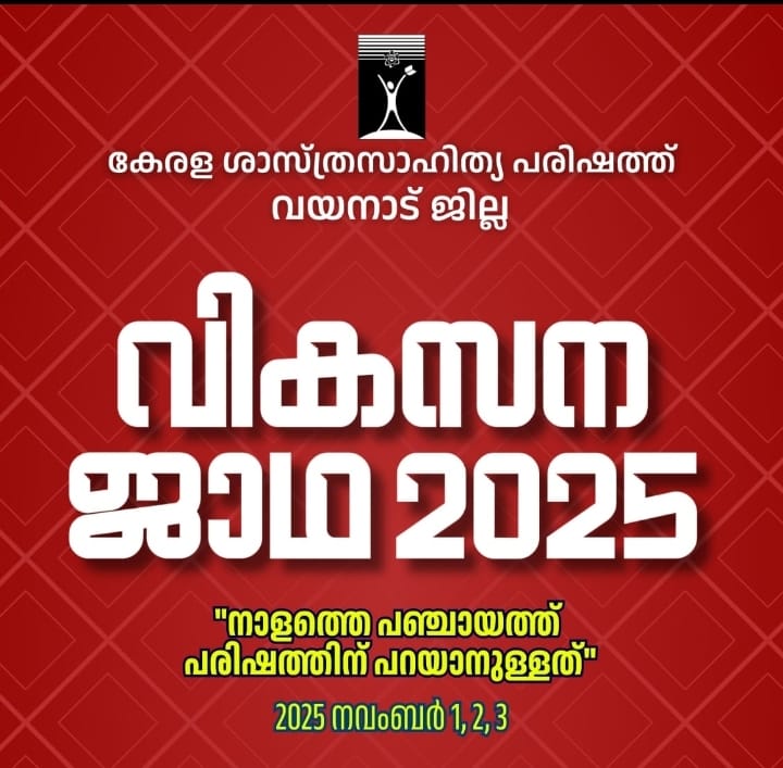 കൽപ്പറ്റ : ജനകീയ ആസൂത്രണം മൂന്നു പതിറ്റാണ്ട് പിന്നിടുകയും സംസ്ഥാനം പ്രാദേശിക തെരഞ്ഞെടുപ്പിനടുത്ത് എത്തിനിൽക്കുകയും ചെയ്യുമ്പോൾ അധികാരവികേന്ദ്രീകരണം പിന്നിട്ട ദശകങ്ങൾ മുന്നോട്ടുള്ള വഴികൾ എന്ന സംസ്ഥാന വികസന ക്യാമ്പയിൻ്റെ ഭാഗമായി കേരള ശാസ്ത്രസാഹിത്യ പരിഷത്ത് വയനാട് ജില്ലാ കമ്മിറ്റിയുടെ ആഭിമുഖ്യത്തിൽ നവംബർ 1, 2, 3 തീയതികളിൽ ജില്ലയിൽ വികസനജാഥ പ്രയാണം നടത്തുകയാണ്.